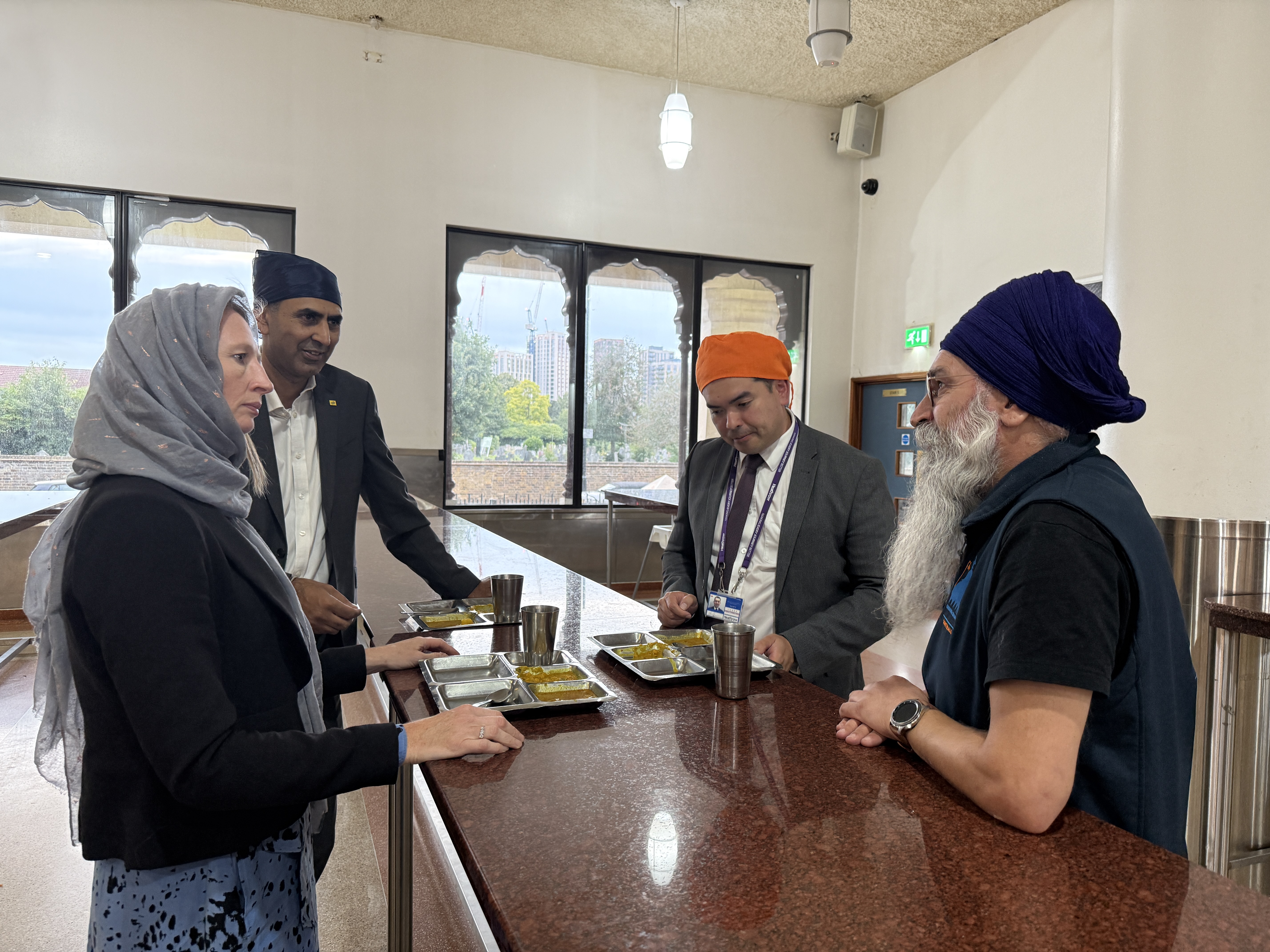 Image 2 from left to right: Becky Coffin (Communities and Sustainability Director), Parmjit Dhanda (Back Heathrow Executive Director), James Holmes (Head of Local Strategic Engagement) and Navraj Singh of the Sri Guru Singh Sabha Southall Gurdwara - enjoying a meal together before the meeting starts